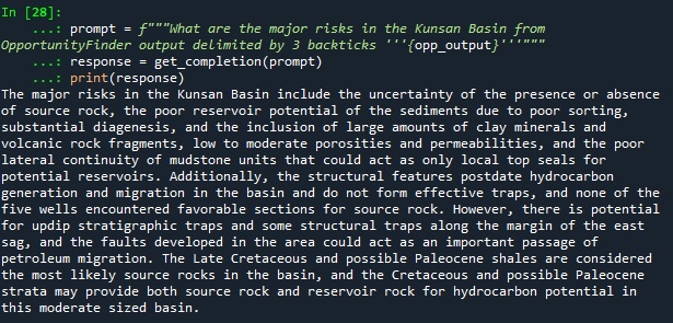 Applying ChatGPT to subsurface and wells content. We have been applying OpenAI’s ChatGPT to the graph data structures produced by the OpportunityFinder(R) and GeoClassifier(R) NLP algorithms after they have processed unstructured data (reports, presentations, literature etc) at a sentence level.